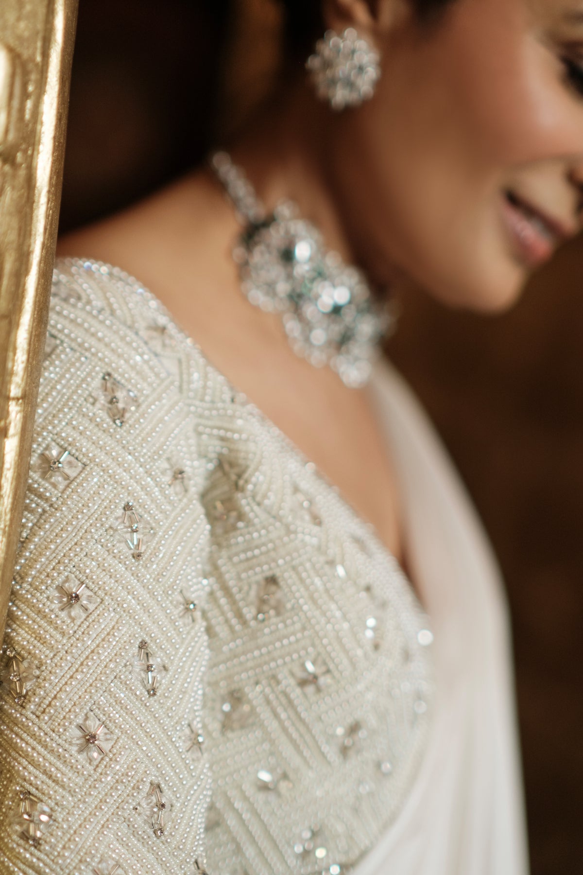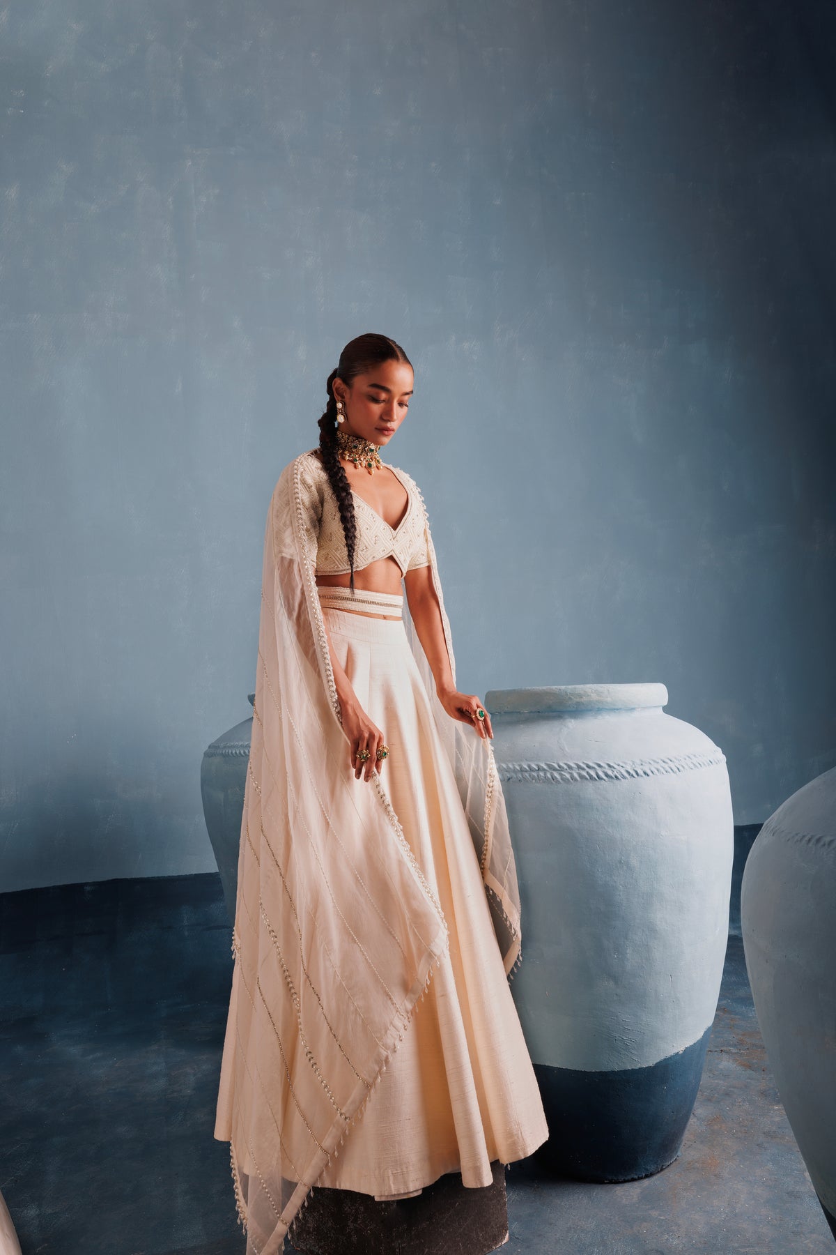 A raw silk ivory pearl blouse featuring a graceful sweetheart neckline, exuding timeless sophistication. Intricately embellished with delicate pearls, it captures a subtle sheen that enhances its luxurious texture. The soft ivory tone complements all skin tones, while the structured yet feminine cut flatters the silhouette. Perfect for pairing with sarees, lehengas, or draped ensembles, this blouse seamlessly blends classic charm with modern allure.
