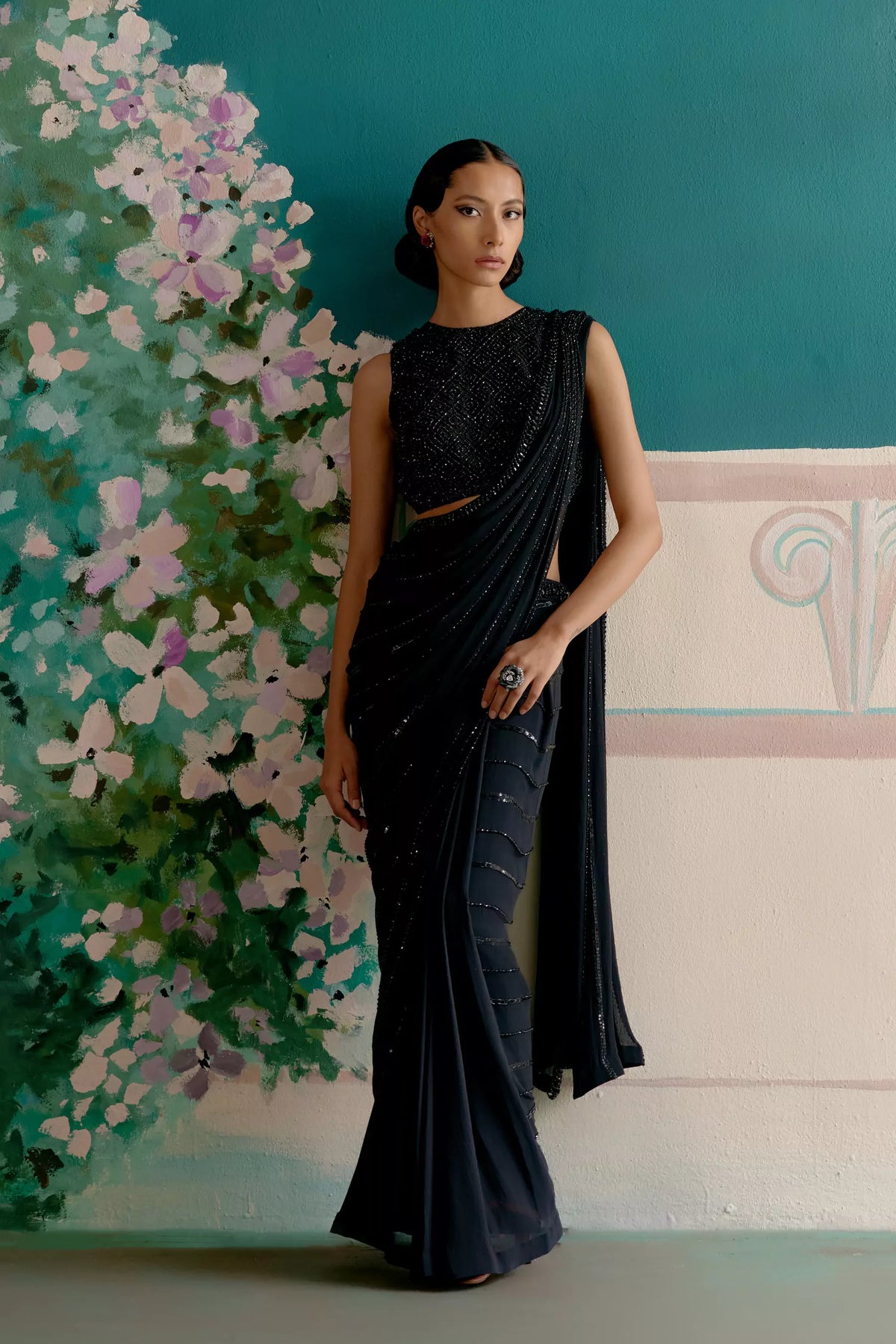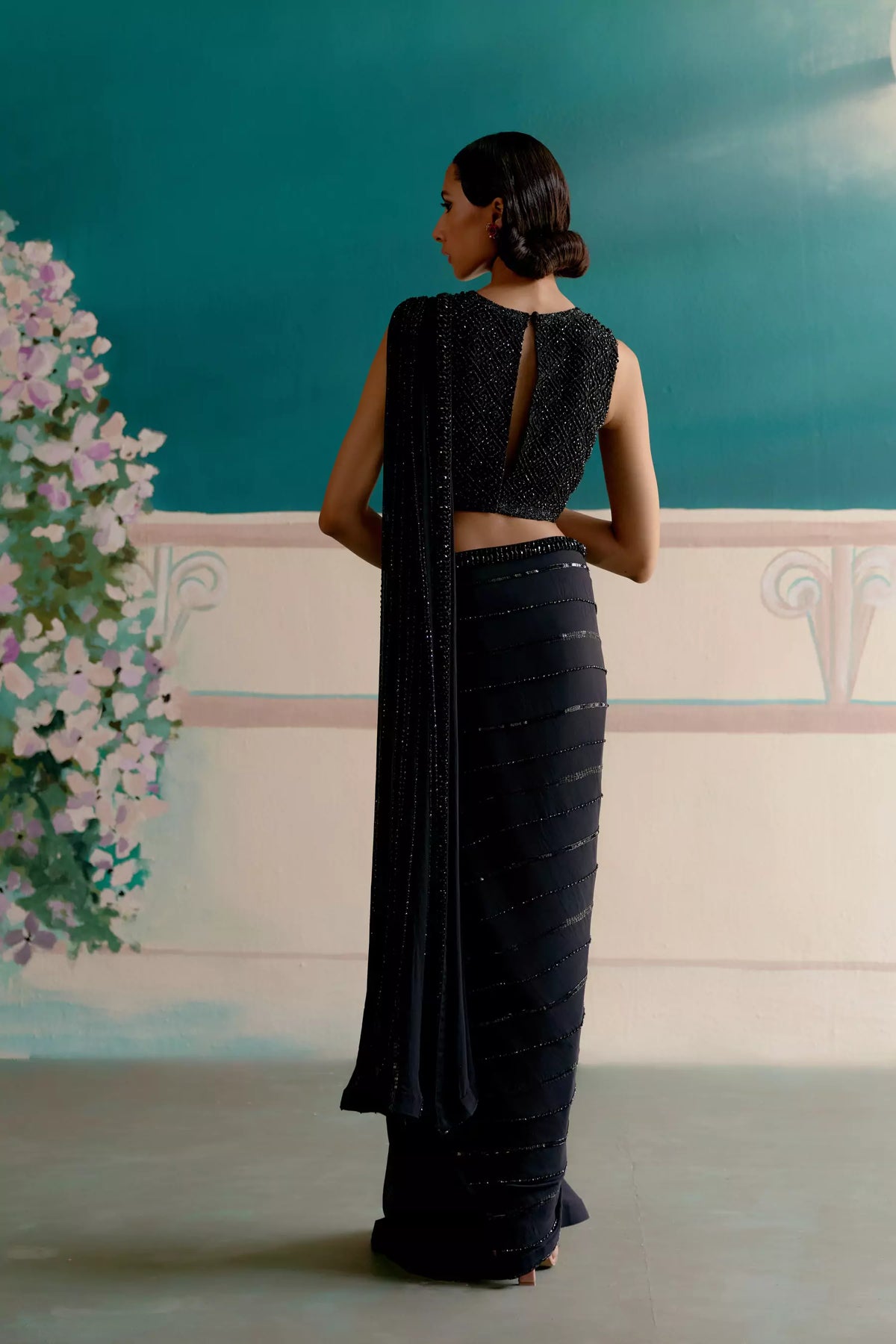 A masterpiece of craftsmanship, this blouse embodies understated luxury and timeless allure. Meticulously hand-embroidered with intricate detailing, it shimmers with the elegance of a starlit night. The refined silhouette flatters effortlessly, blending structure with softness for unmatched comfort and grace. Designed to complement any statement ensemble, this blouse stands as a celebration of artistry — where every thread tells a story of sophistication and charm.