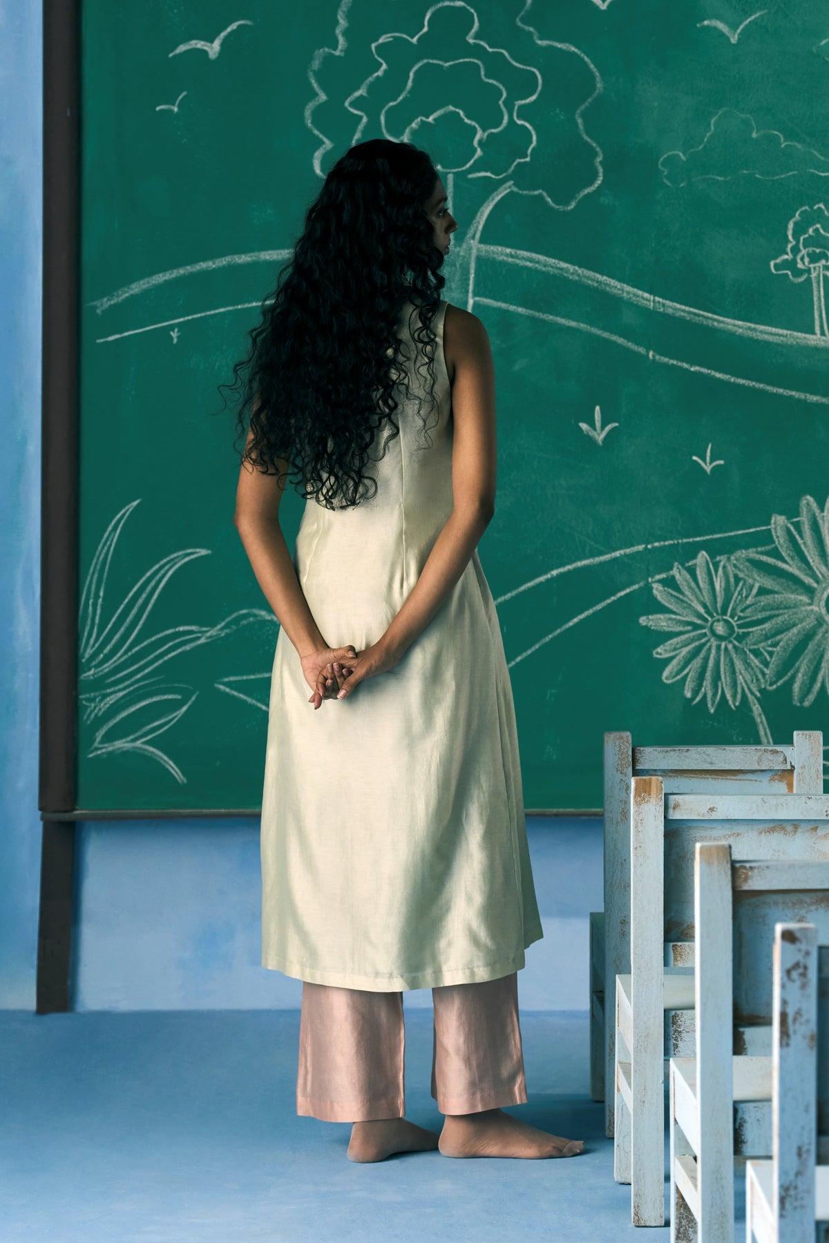 A sleeveless, high-neck tunic in a soothing pastel shade, adorned with intricate hand-embroidered floral motifs in delicate blush tones. Designed with a front slit for effortless movement, it is paired with soft, flowy trousers for all-day comfort.