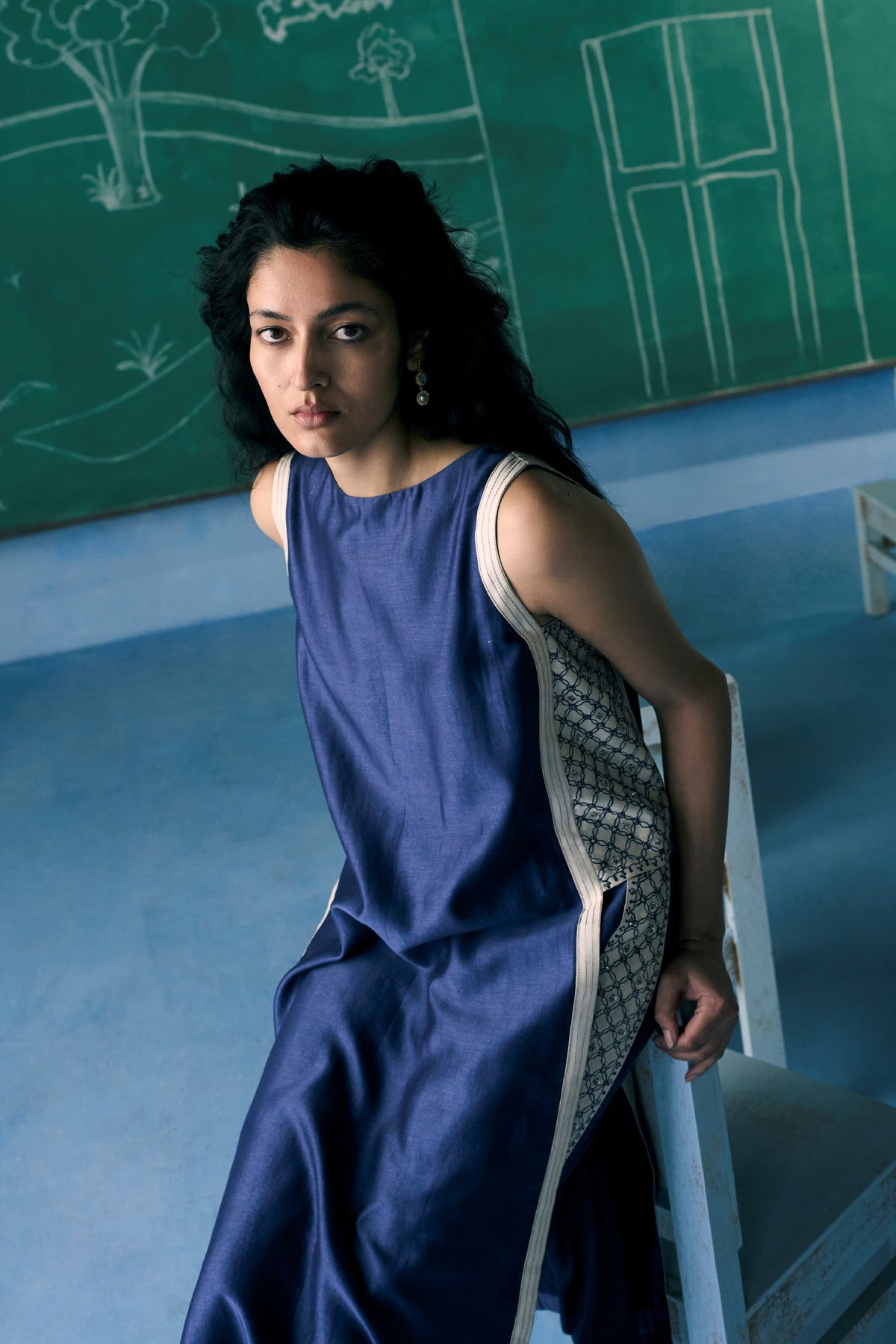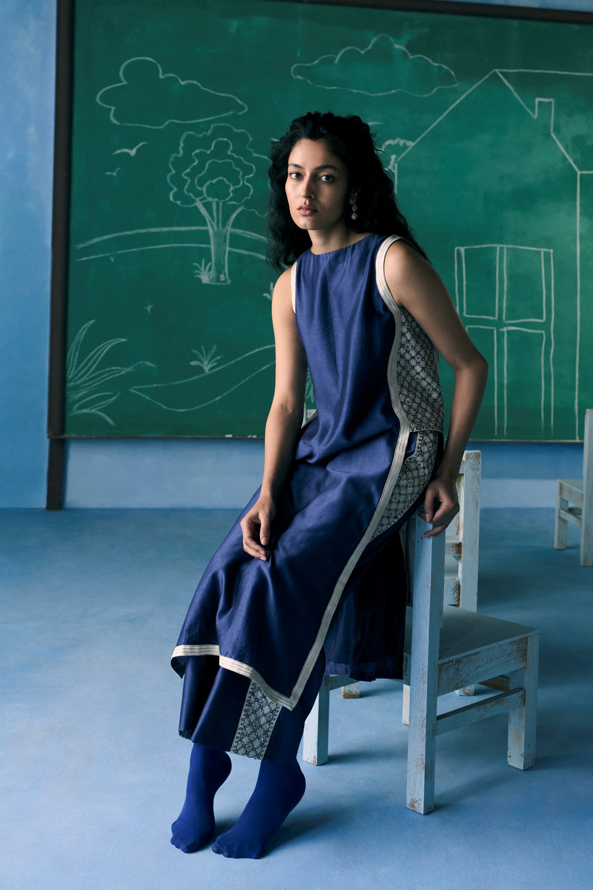 Crafted in a deep midnight blue, this Indo-Western ensemble features a sleeveless tunic, intricate hand embroidery along the sides, and wide-leg pants adorned with delicate detailing. Designed for the contemporary woman, this versatile outfit is perfect for day-to-night wear, casual gatherings, and festive occasions.