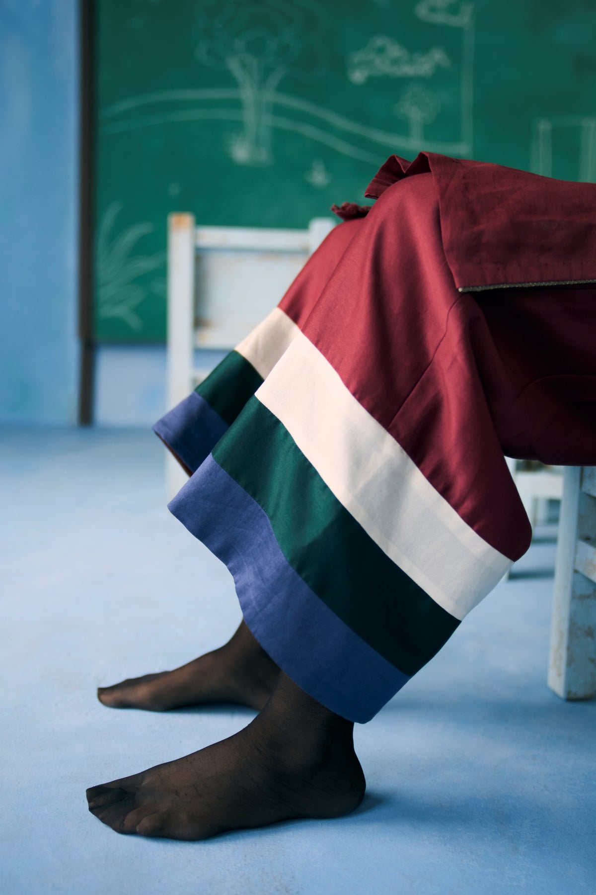 Crafted from pure Chanderi flowing fabric in a deep crimson this statement ensemble features a relaxed straight-cut kurta with delicate pin-tuck details and intricate hand embroidery.