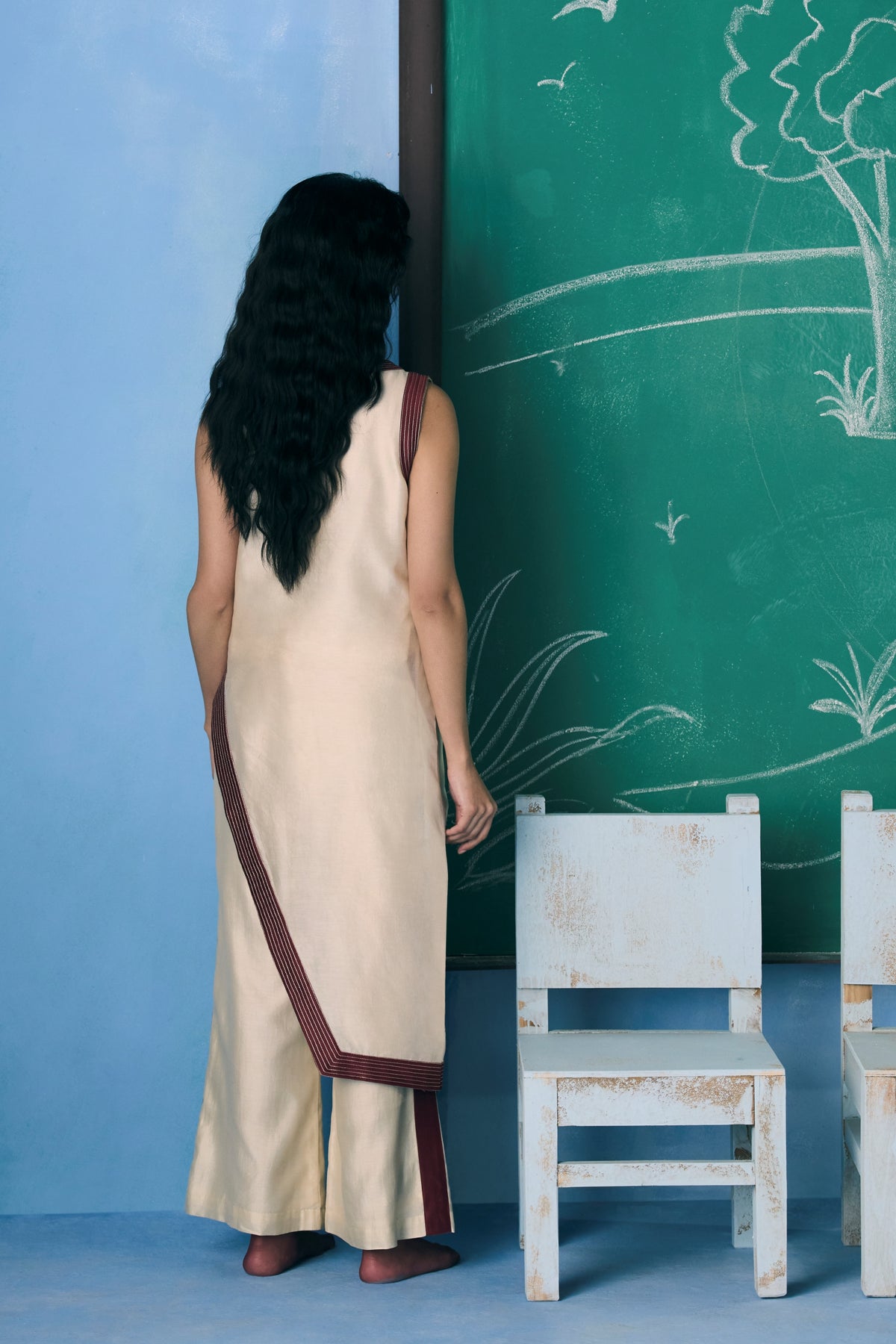 An asymmetrical ivory co-ord featuring a sleek sleeveless silhouette accented with crimson piping and a hand-embroidered motif.