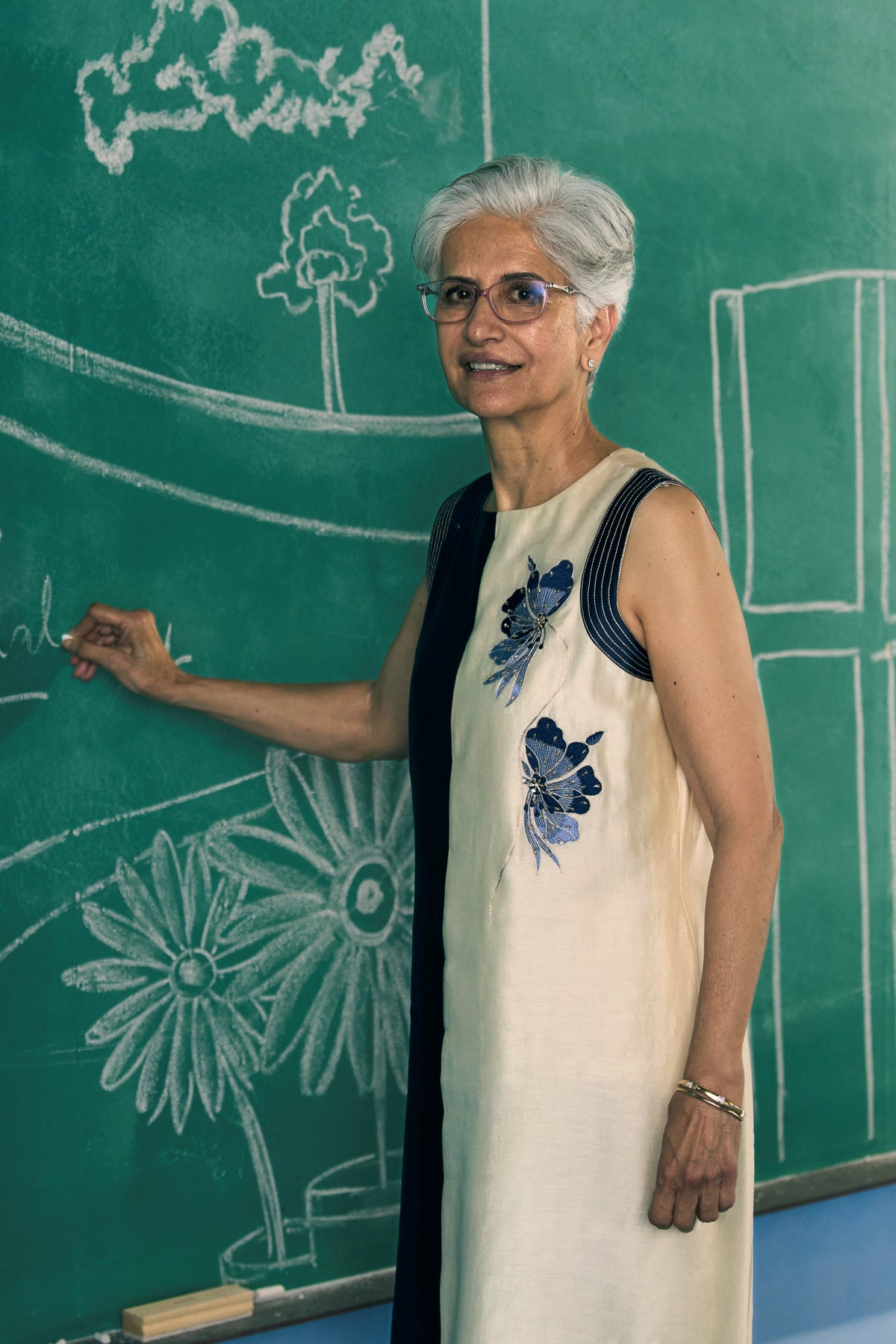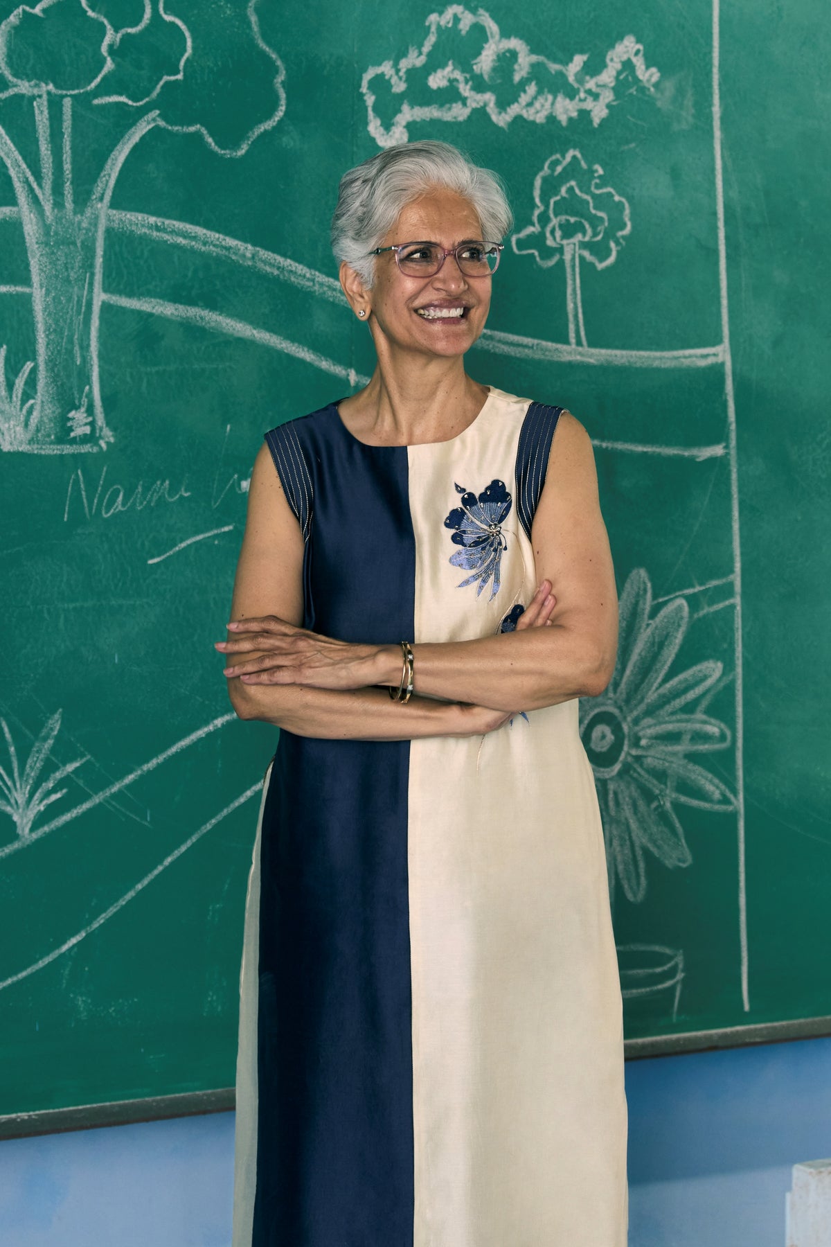 A neck-to-toe ivory & blue colour-block dress, crafted in pure Chanderi silk, designed for effortless elegance from day to night. The elongating vertical panels create a sleek silhouette, adding the illusion of extra height. Featuring a minimal zero neckline, this piece needs no embellishment—just a pair of statement earrings and a delicate bracelet to complete the look.
