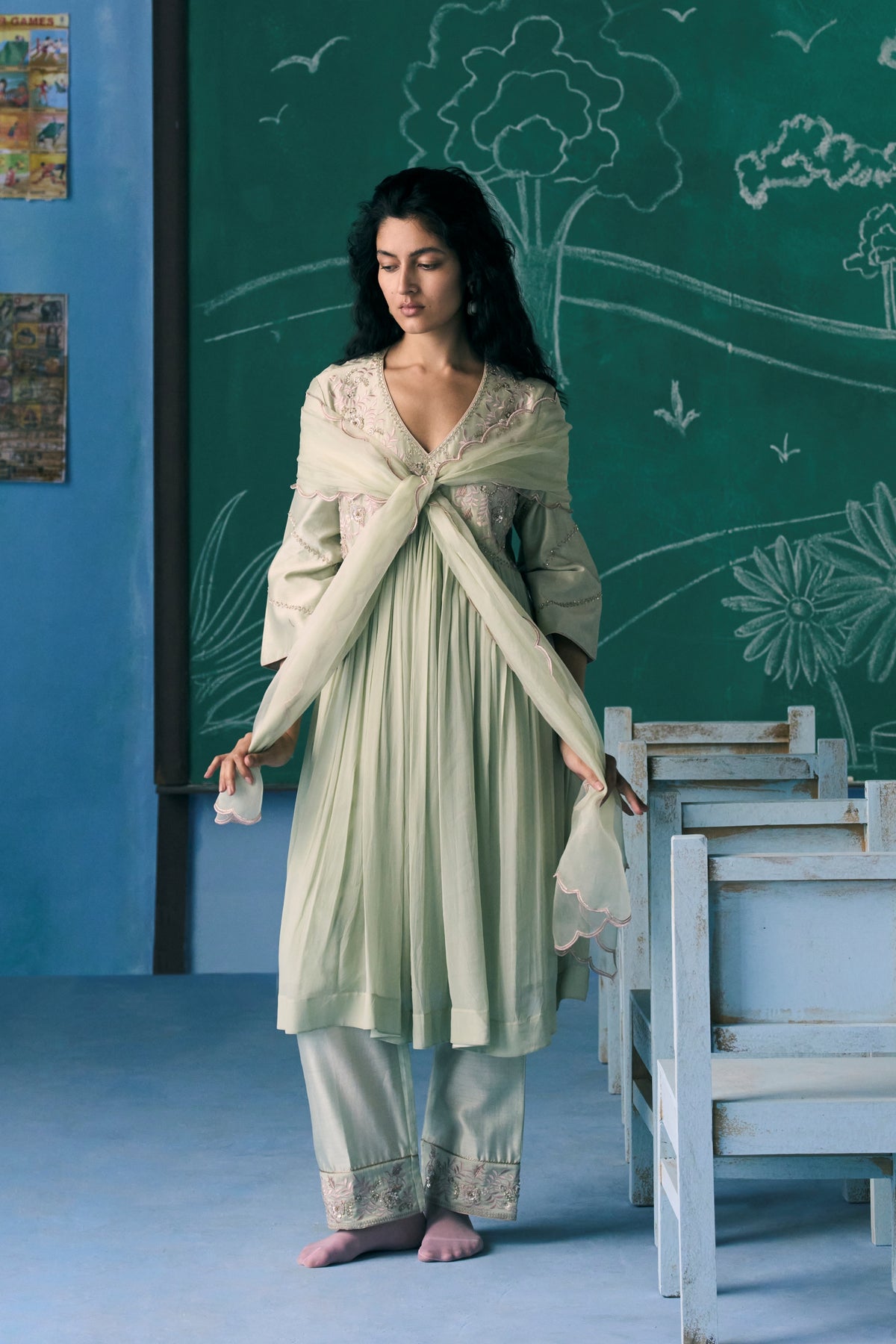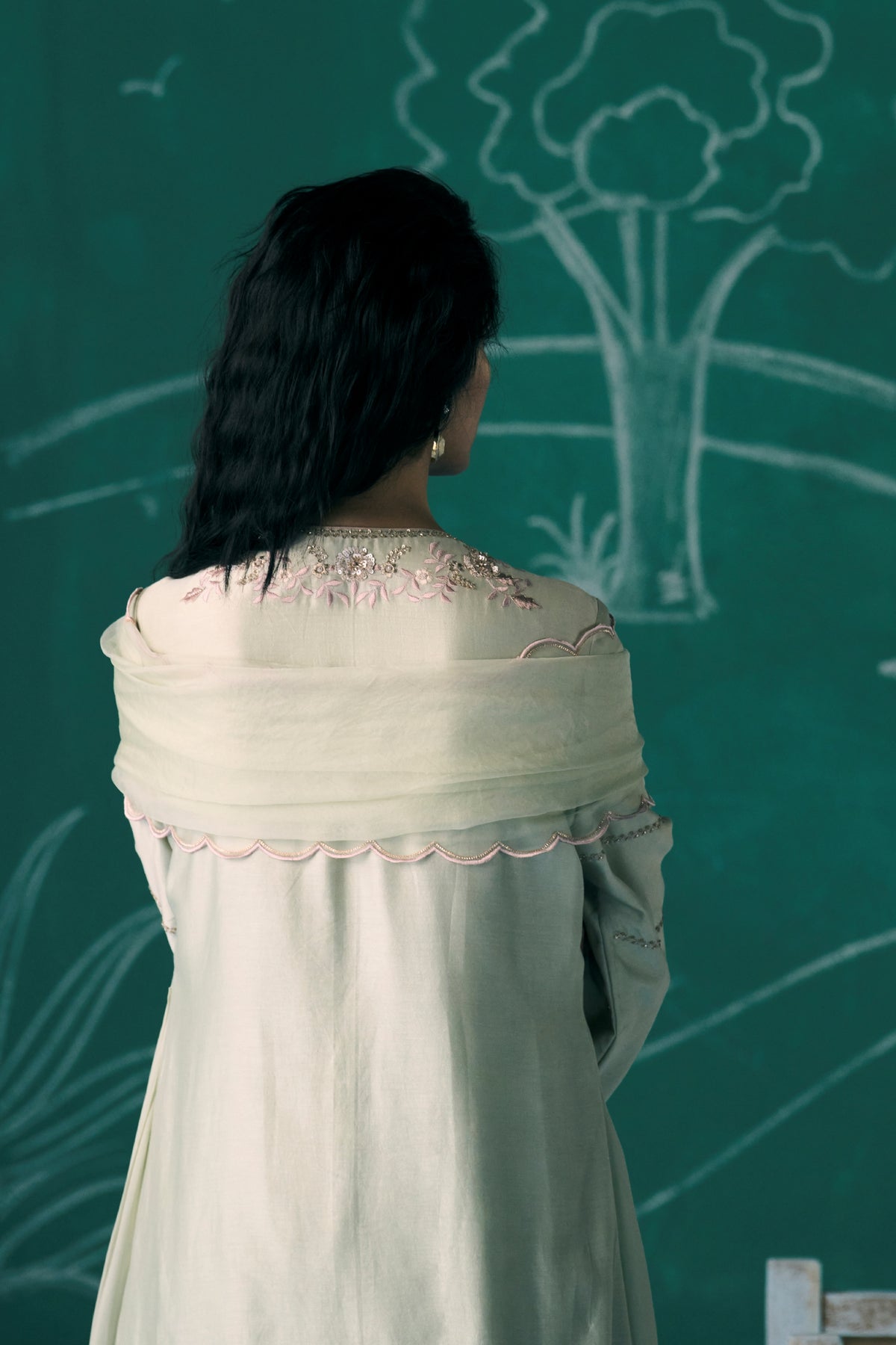 Crafted from soft, flowy fabric, this ensemble features delicate hand embroidery, scalloped detailing, and a dreamy silhouette that moves with effortless grace. The intricately embroidered hem and sheer dupatta add a touch of vintage charm, making it perfect for intimate celebrations and everyday luxury.